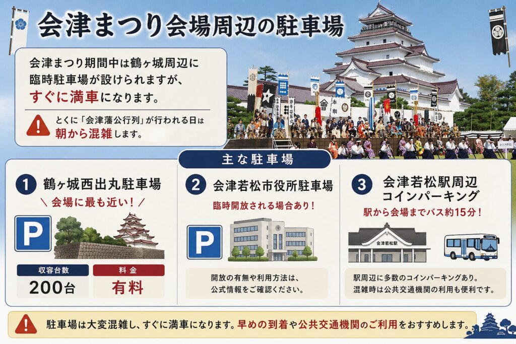 | 会場周辺の駐車場 | 鶴ヶ城西出丸駐車場(200台・有料)が最寄りだが早い時間に満車。会津若松駅周辺のタイムズのBで事前予約がおすすめ。 |