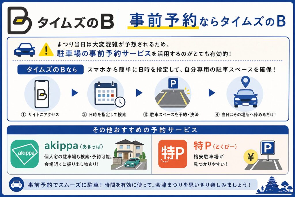 会津まつり当日は大変混雑が予想されるため、駐車場の事前予約サービスを活用するのがとても有効です。