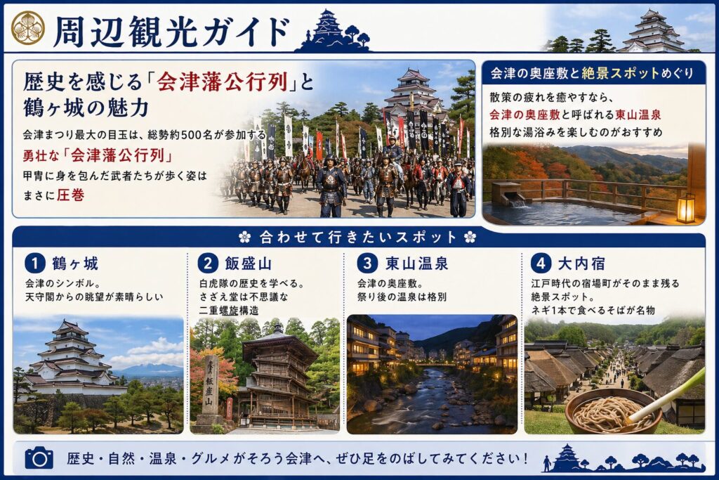 また、大内宿まで足を延ばして名物の「ネギそば」を味わうのがおすすめのモデルコースです。観光客が見落としがちなポイントを押さえれば、旅の満足度がグッと上がります。