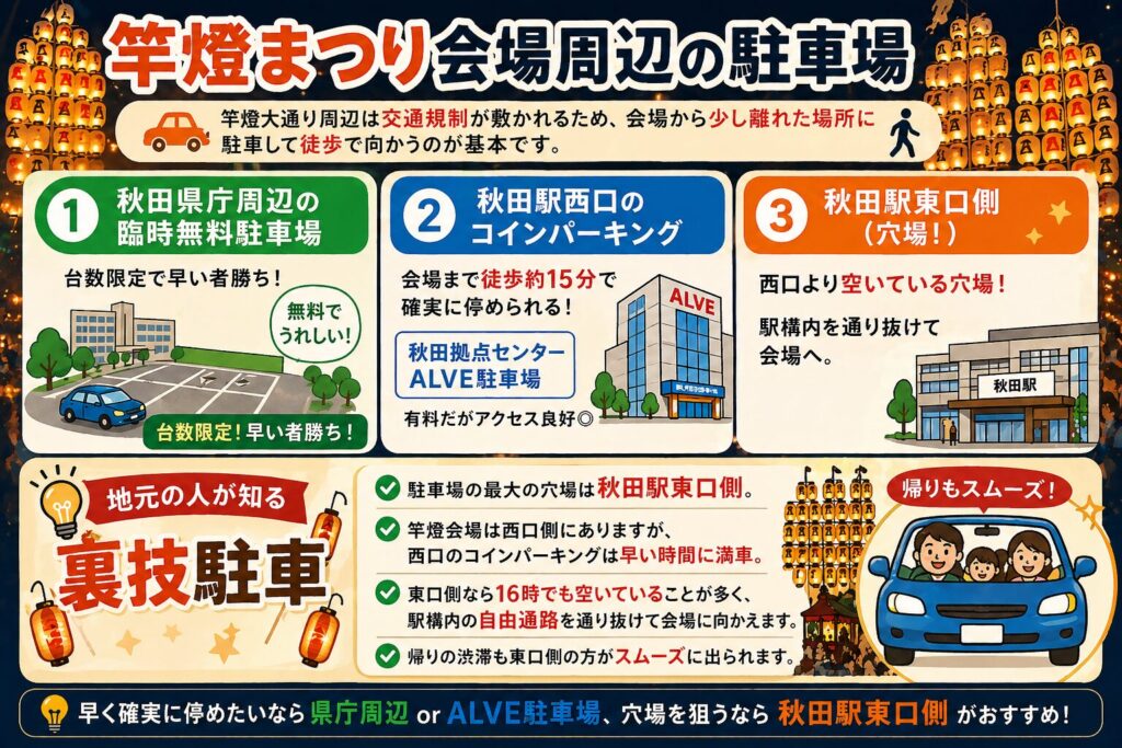 駐車場の最大の穴場は秋田駅東口側。竿燈会場は西口側にありますが、西口のコインパーキングは早い時間に満車。東口側なら16時でも空いていることが多く、駅構内の自由通路を通り抜けて会場に向かえます。帰りの渋滞も東口側の方がスムーズに出られます。