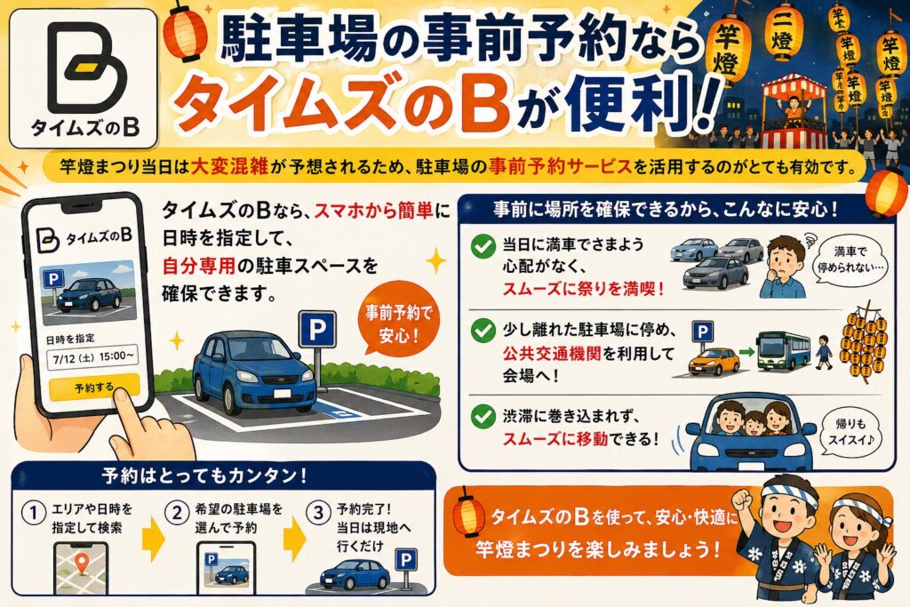 竿燈まつり当日は大変混雑が予想されるため、タイムズのBのような駐車場の事前予約サービスを活用するのがとても有効です。
