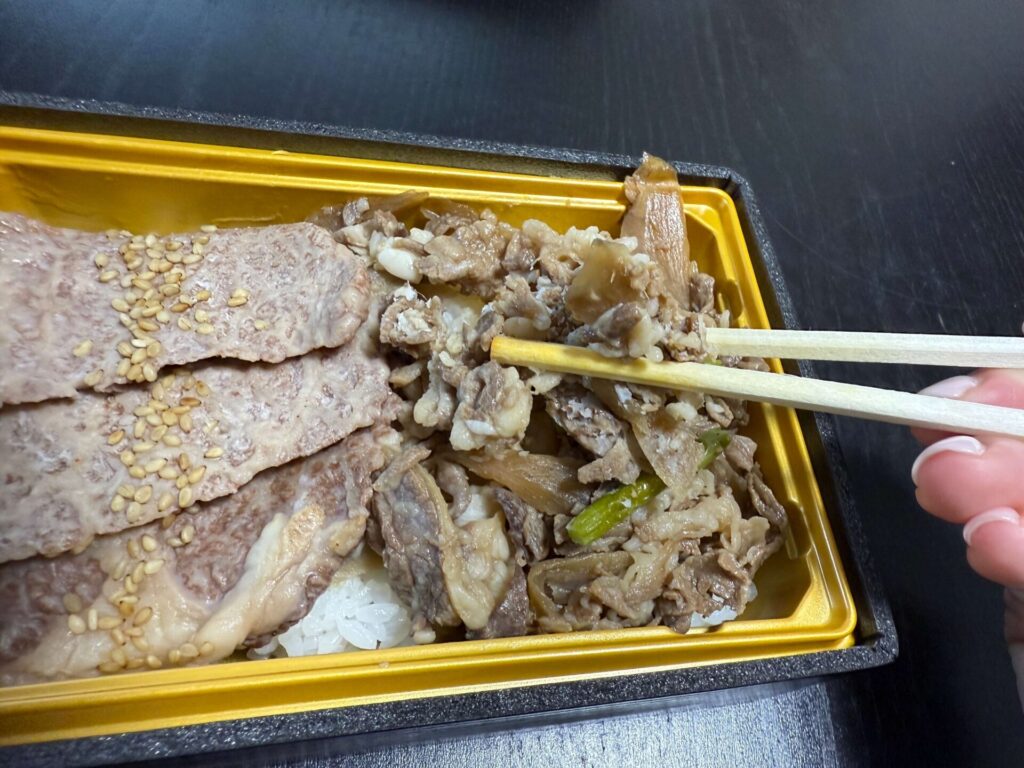結論から言えば、十分満足できます。ご飯は、おおよそ普通サイズより少し少なめですが、二種類のブランド牛がぎゅっと詰まっているため、食べ進むにつれて、その満足感は次第に高まっていきます。