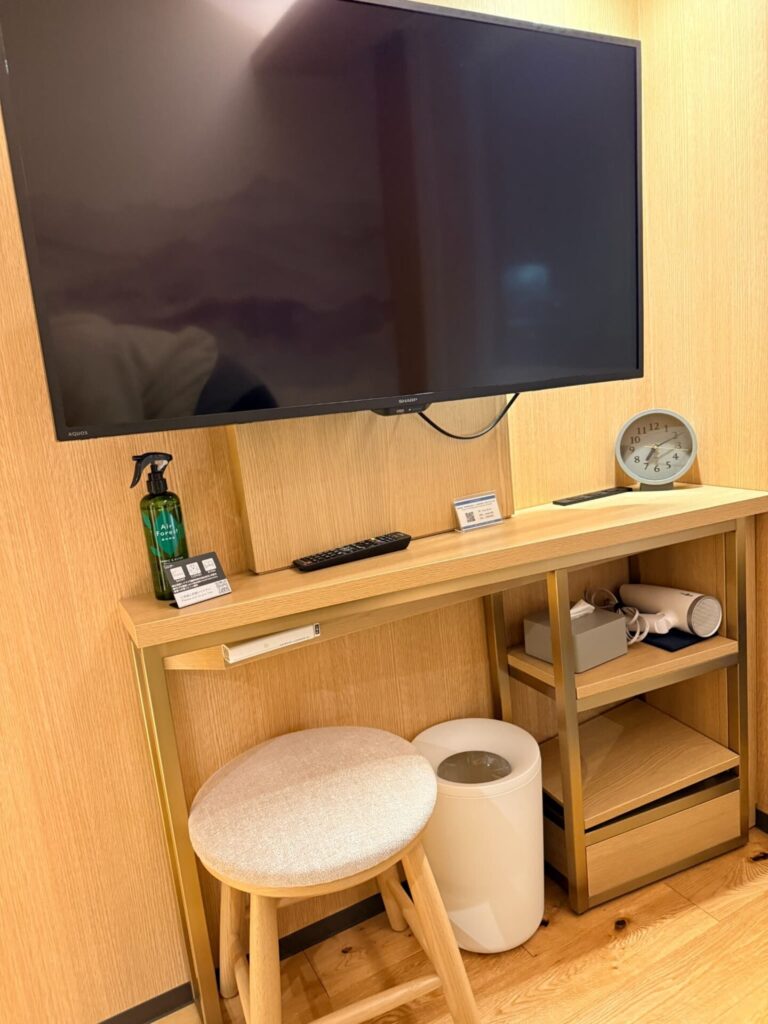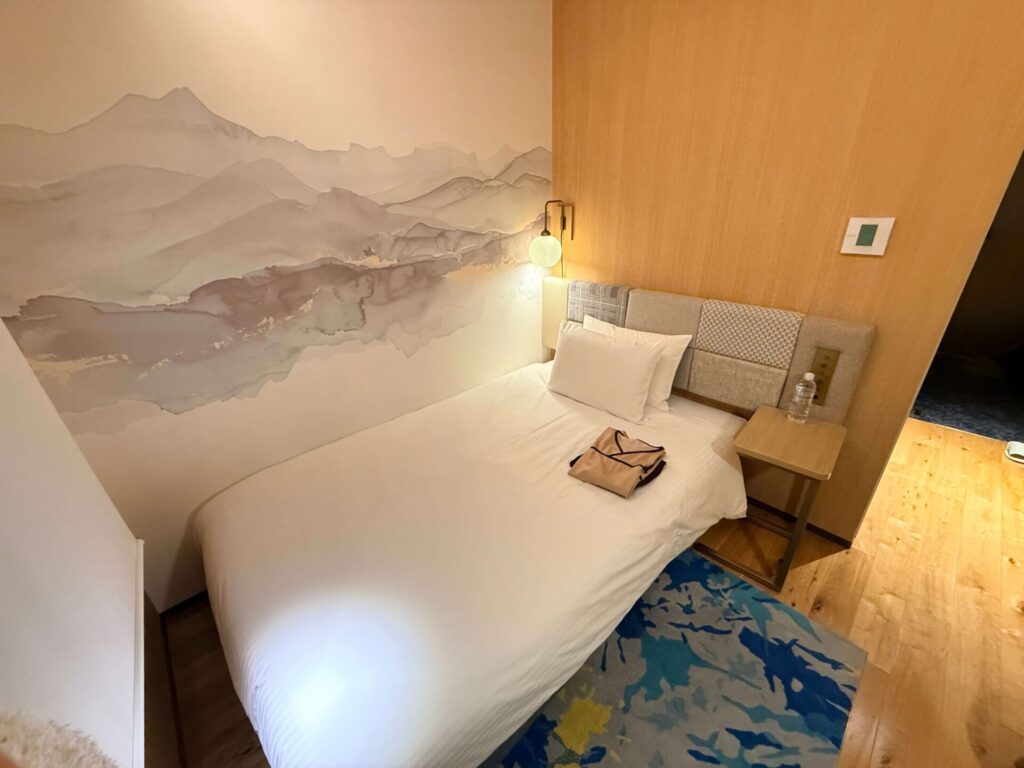 客室に入ると、まず目に飛び込んでくるのは木の温もりです。ベッドのフレーム、フローリング、壁面——至るところに秋田杉が使われています。北欧風のシンプルで機能的な設計の中に、日本の地域材を生かした工夫が見られます。