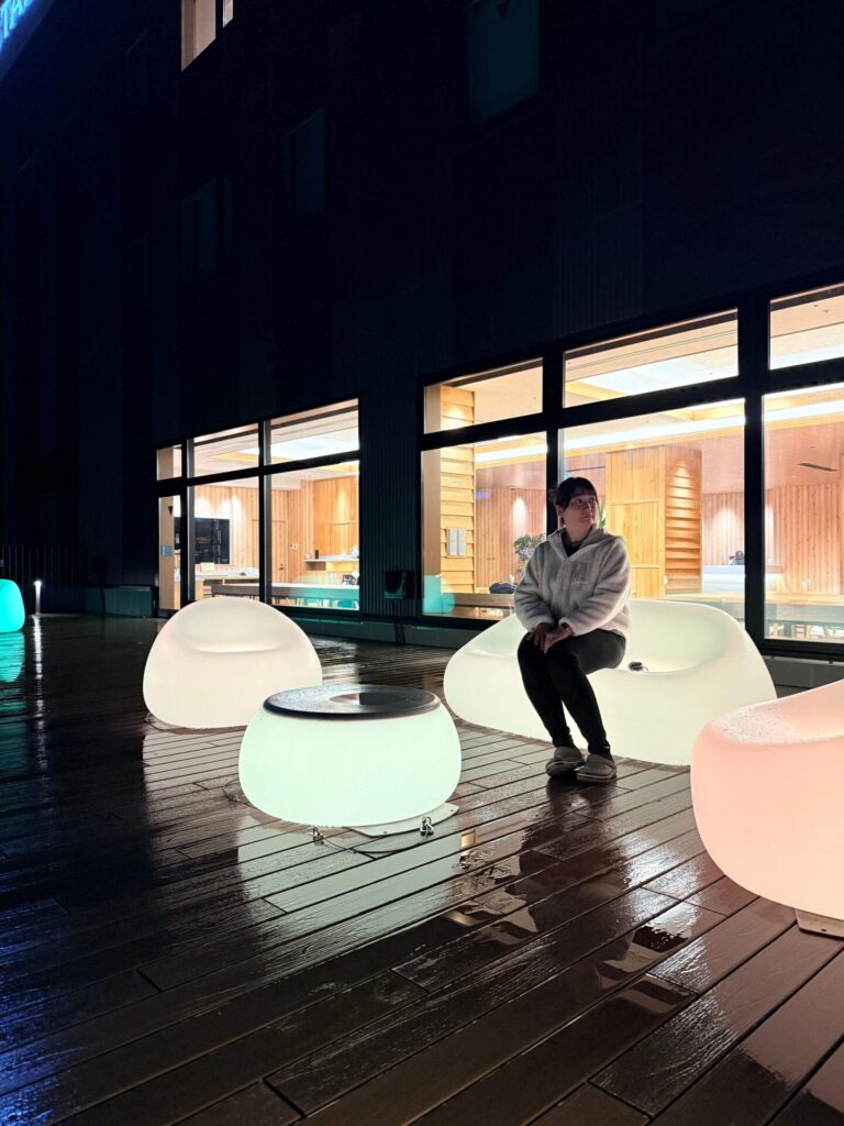 ロビーから展望テラス出られるのですが、そのテラスに置かれた、あるオブジェが目を引きます。ネオンの椅子です。色は一色ではなく、ブルーやピンク、そのほかの色にも変化する設計。館内は北欧デザインの落ち着いた空間ですが、バルコニーにポップで遊び心のあるアクセントを加えています。