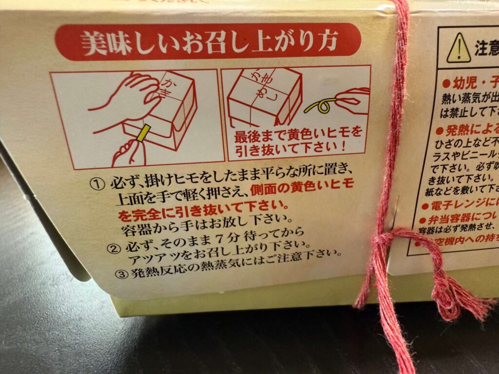 パッケージを開けると赤い紐と黄色い紐。黄色の紐を引くと容器底部の生石灰と水の化学反応により加熱が始まります。安全な仕組みですが、やけどには注意が必要です。