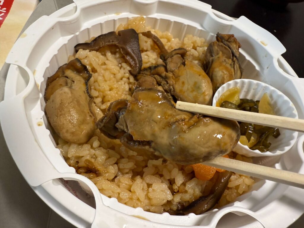 7分後に蓋を開けると湯気と共に牡蠣の磯の香りがふわっと広がります。冷たい駅弁では味わえない感動です。