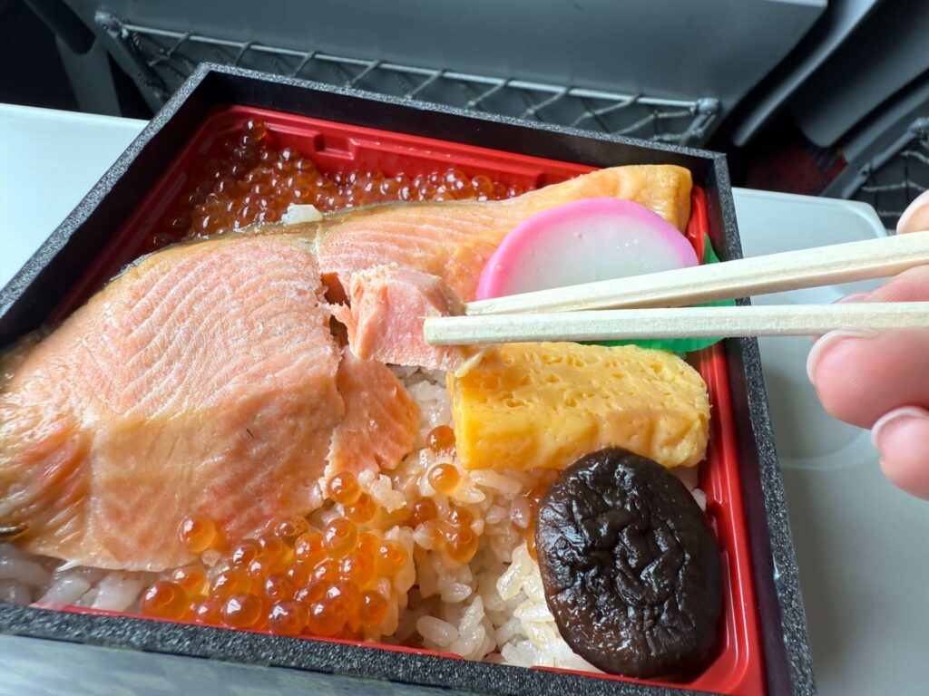 まず驚いたのが、ご飯の美味しさ。鮭だしで炊かれたご飯は、ほんのり酢飯風の爽やかな味わい。車内で食べることを考えた工夫で、重たくなりすぎずお箸が進みます。