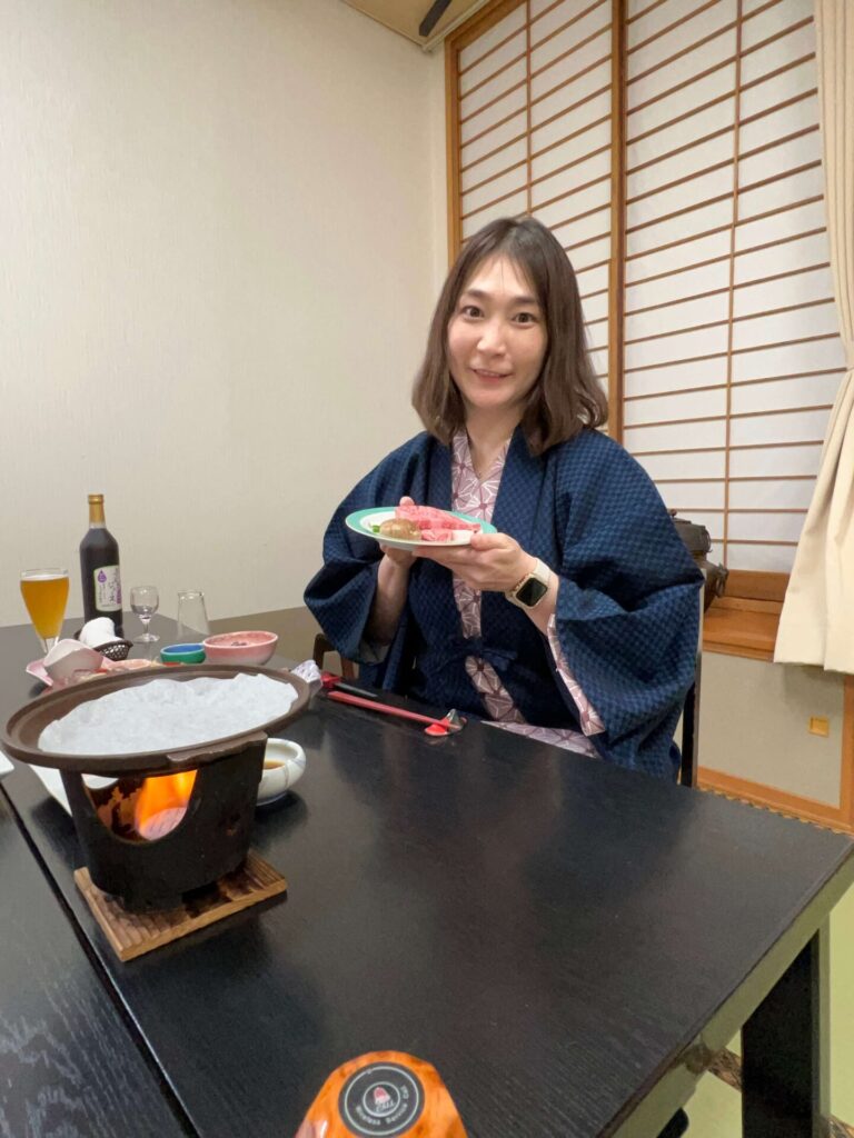 お食事はA5ランクの米沢牛。すき焼きやステーキ付き会席など、山形の旬の素材とともに味わえます。