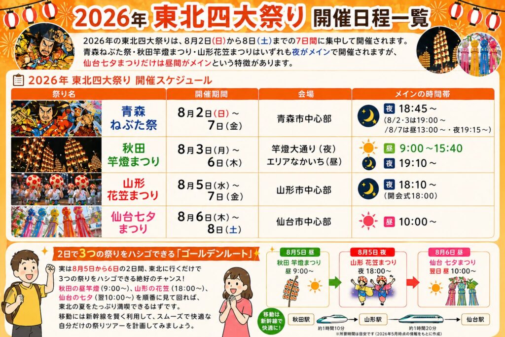 2026年の東北四大祭りは、8月2日(日)から8日(土)までの7日間に集中して開催されます。青森ねぶた祭・秋田竿燈まつり・山形花笠まつりはいずれも夜がメインで開催されますが、仙台七夕まつりだけは昼間がメインという特徴があります。